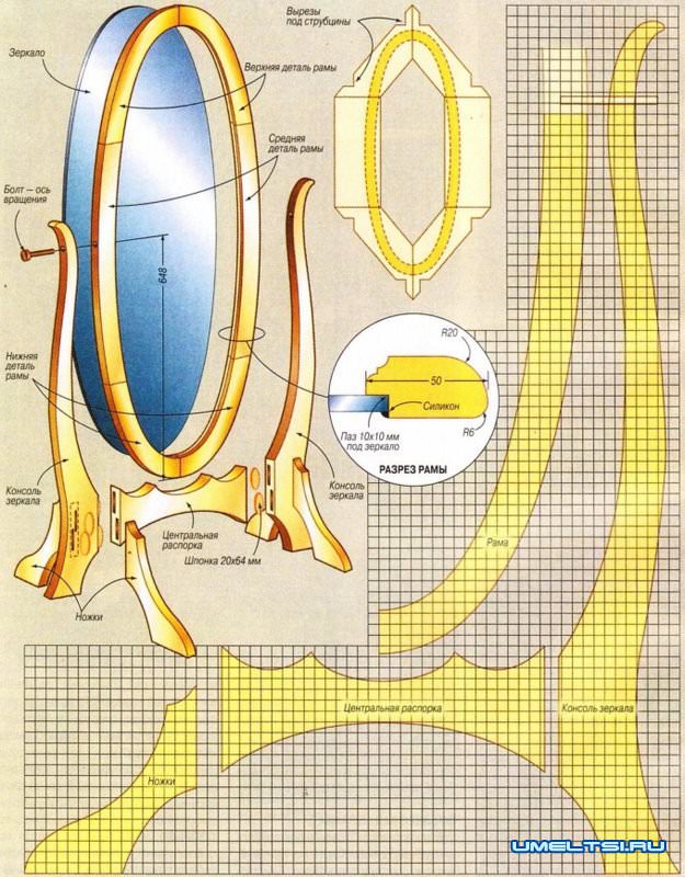 Все детали сначала покройте тремя слоями тунгового масла, а потом восковой пастой. В раму вложите зеркало и подложку толщиной 3 мм из МДФ или оргалита и закрепите их на месте валиком силиконового герметика.