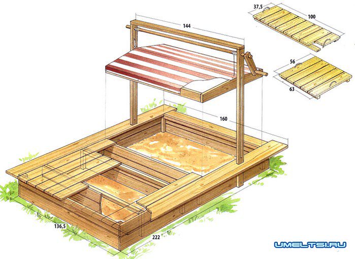 Любимым местом для детей всегда была песочница. Дети на свежем воздухе и с увлечением играют в свои игры, общаются со своими сверстниками. Сегодня предлагаем сделать самую лучшею песочницу для своих любимых чад. В этой песочнице конструкцией предусмотрено традиционный отсек для песка, емкость для воды, а также навес-тент, который будет затенять от знойного солнышка.