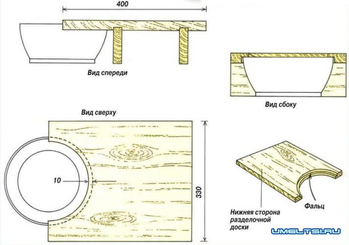 5. С нижней стороны разделочной доски параллельно выпиленному полукругу фрезой выбирают фальц размерами 10x10 мм.