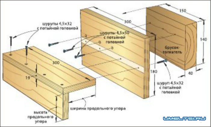 Примечание. Чтобы приспособление легко скользило по продольному упору, при сборке вложите между одной из вертикальных деталей и упором лист бумаги для получения небольшого зазора. Затем из любого имеющегося под рукой материала (например, обрезка сосновой доски) выпилите подпорный брусок-толкатель. Зафиксируйте на месте продольный упор станка, наденьте сверху приспособление и прикрепите брусок-толкатель шурупами к высокой детали приспособления. Не применяйте клей, чтобы проще было заменить изношенный брусок. Наконец, смягчите все острые углы и ребра с помощью шлифовальной колодки. Так же рекомендуем все вскрыть лаком, что предотвратит впитывание влаги.