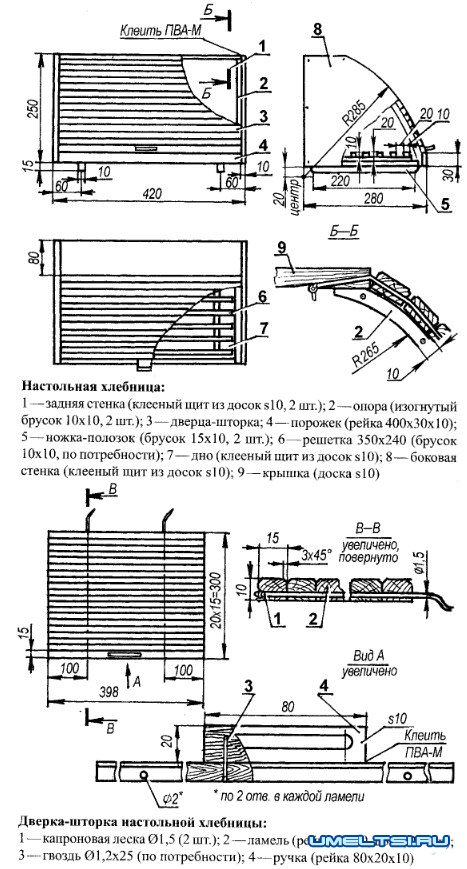 Собирал детали хлебницы в единую конструкцию на клее ПВА и с помощью маленьких гвоздей. После высыхания клея все стыки и поверхности тщательно «зашкурил». Шторку-дверку хлебницы собрал из ламелей реек сечением 15x10 мм на двух отрезках капроновой лески. Для пропуска лески в каждой рейке просверлил по два отверстия. Для крепления шторки к хлебнице в ее крышке тоже просверлил два наклонных соответствующих отверстия вставив в них концы отрезков лески, крепко их связал. После этого к дверке прикрепил (клеем и гвоздиками) ручку, а ко дну ножки-полозки. Еще на дно внутрь хлебницы установил решетку, изготовленную из таких же реек, что и шторка. В завершение снаружи покрыл хлебницу бесцветным лаком.