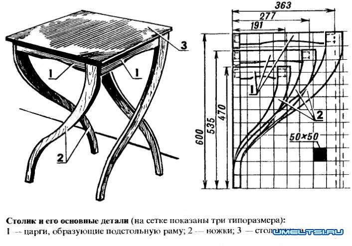 Это не большой обеденный, а легкий: шахматный, косметический или журнальный. Для столешницы в любом из трех названных вариантов подойдет лист фанеры толщиной 12 мм. Размеры столешницы лучше выбирать такими, чтобы ее края нависали над подстольем со всех сторон примерно на 50 мм.