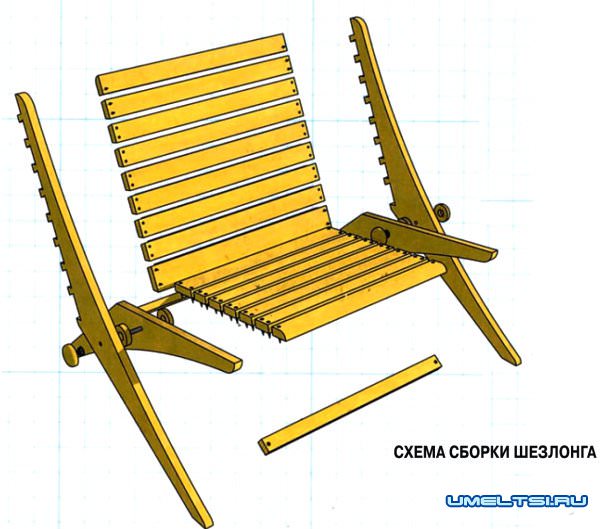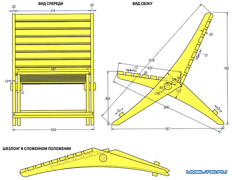 Шайбы облегчают складывание шезлонга и снижают опасность защемления пальцев. Чтобы ножки хорошо вращались, в процессе крепления необходимо слегка их зачистить. В завершение работ прикрепите нижние переднюю и заднюю поперечины. Ваш шезлонг сделанный своими руками готов — остаётся покрыть его тонированной морилкой и атмосферостойким лаком.