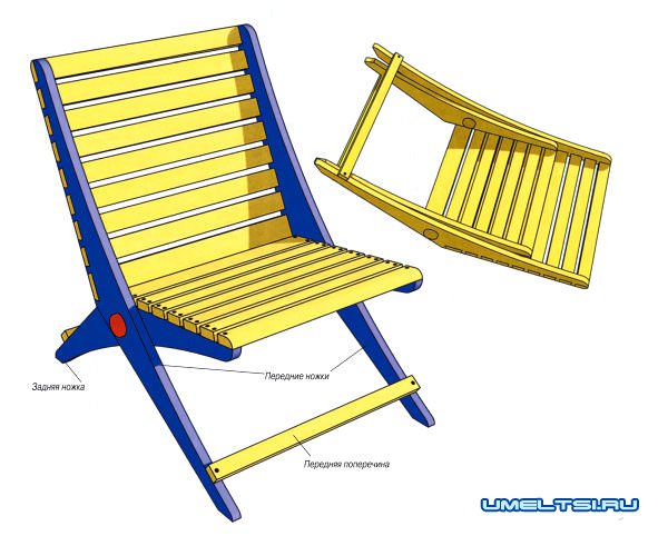 Клеем и шурупами прикрепите планки к передним и задним ножкам, предварительно скруглив рёбра и кромки планок. Планки сиденья располагаются на верхних кромках задних ножек. Головки шурупов должны быть утоплены в древесину и заглушены вклеенными деревянными пробками.