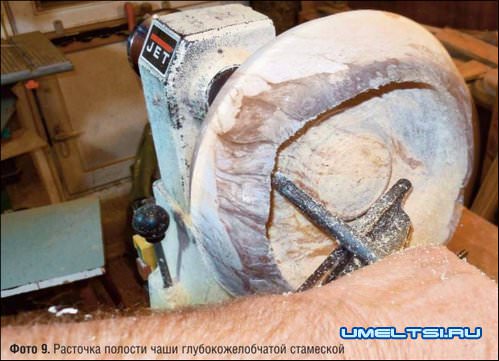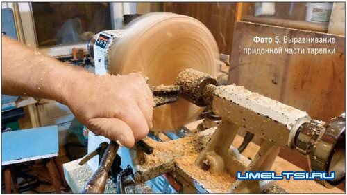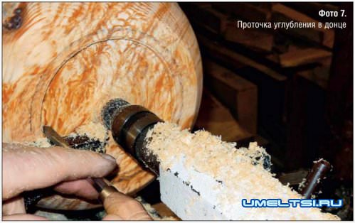 В качестве ненавязчивого украшения и без того привлекательной наружной поверхности тарелки, опять-таки воспользовавшись глубокожелобчатой стамеской (фото 6), примерно в середине изделия я сформировал буртик (валик) не совсем обычной острой формы с плавным сбегом в обе стороны. При этом соблюдались два основополагающих правила: прижимать фаску стамески к древесине и вести ее снизу вверх, что гарантирует от зарывов и дает чистую поверхность, ведь срезаемые волокна поддерживаются вышележащими. Чрезмерно сильное прижатие фаски может вызывать сжатие волокон, нежелательность которого отмечена выше.