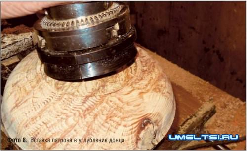 Переворачиваем тарелку, вставляем в ее донное углубление патрон с кулачками типа G (фото 8). Теперь необходимо повернуть ключ в патроне до упора последовательно в каждом из трех его гнезд, зажать тарелку кулачками враспор и навинтить патрон на шпиндель станка. Считается, что такая фиксация изделия менее надежна, чем при захвате выступающего донца, и поэтому более пригодна для крепления именно неглубоких тарелок и чаш. Но и в этом случае не следует форсировать процесс расточки полости.