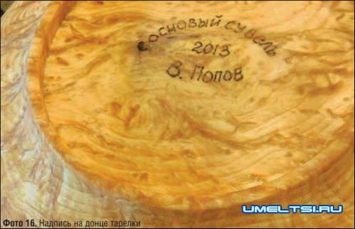 Поскольку при запускании руки со шкуркой внутрь вращающейся на станке чаши с неровным природным краем его выступы больно бьют по пальцам, я воспользовался медицинским инструментом, называемым изогнутым корнцангом (фото 15). Наиболее удобной для шлифовки, по моему опыту, является наждачная бумага на поролоновой основе. К сожалению, пока не нашел подобной водостойкой наждачной бумаги с зернистостью 1200-1500 ед. для шлифовки лака перед его располировкой, а испытанные абразивы на мягкой тканевой основе не очень хорошо разравнивают поверхность, поскольку не обладают подходящей жесткостью. Продолжу поиски. Той же наждачной бумагой Smirdex я быстро отшлифовал и наружную поверхность чаши, прижимая, как полагается, «шкурку» к нижней части тарелки, вращающейся на минимальных оборотах во избежание возможной травмы пальцев. Черный раструб справа от чаши на фото 15 - это воздухозаборная часть, присоединенная шлангом к промышленному пылесосу для борьбы с пылью при шлифовке. Снял чашу с токарного станка и вручную слегка подшлифовал углубленное донце. Кстати, кулачки патрона не оставили ни малейших следов на древесине. По традиции сделал надпись на донце тарелки с указанием вида древесины, даты изготовления и своей фамилии(фото 16). Далее с использованием промышленного термофена сначала пропитал тарелку кипящей олифой, высушил, а затем покрыл ее несколькими слоями акрилполиуретанового лака с промежуточной сушкой и шлифовкой, после чего располировал лаковое покрытие полировальной пастой.