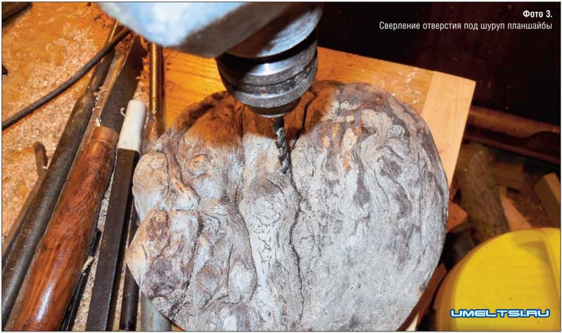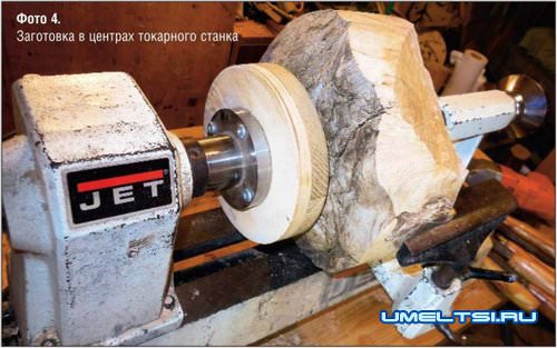 Просверлив глухое центральное отверстие диаметром 6,3 мм (фото 3) и навернув заготовку на шуруп, я убедился, что она не прилегает к планшайбе, упираясь сюда лишь в одной точке далеко от центра. Поскольку крепление показалось не вполне надежным, пришлось подпереть заготовку задней бабкой (фото 4), которая, впрочем, на начальном этапе черновой обработки несбалансированной заготовки применяется практически всегда. После выравнивания обрабатываемой детали заднюю бабку можно будет убрать. Я начал обтачивать заготовку при минимальной частоте вращения, которая у моего станка составляет 500 об/мин, с ее постепенным увеличением до максимума (1200 об/мин). Для заготовок диаметром более 100 мм справедлива следующая формула вычисления безопасных оборотов: произведение диаметра детали в дюймах и частоты вращения в об/мин должно находиться в диапазоне 6000-9000 (зто безразмерная величина, относительные единицы). Так, для моей заготовки диаметром около 200 мм (т. е. 8 дюймов) безопасная частота вращения лежит в пределах от 750 до 1100 об/мин. Следует иметь в виду, что центробежная сила, подчас разрывающая заготовку (особенно треснутую или подгнившую) на части, возрастает соответственно квадрату скорости, как и кинетическая энергия разлетающихся элементов, т. е. сила их удара. При работе на токарном станке нельзя стоять в плоскости вращения заготовки, к тому же необходимо обязательно надевать защитный щиток.