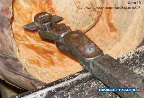 Как и в случае с чашами, я начал его с помощью все той же глубокожелобчатой стамески толщиной 12 мм с так называемой «ирландской заточкой» (фото 9). Этот тип стамесок можно вести внутри только в одном направлении - от края к донышку тарелки. Углубившись приблизительно на 25 мм, я сохранил некоторую ширину фактурного природного обода тарелки, местами превышающую 20 мм. Далее пришло время начать подрезку края, следуя за кривизной внешней поверхности тарелки. Для этого требовалось взять какую-либо другую стамеску с изогнутым цевьем, например, с резцом-насадкой или твердосплавной насадкой. Но тут я вспомнил о коленчатой стамеске, которую сделал четыре года назад, испытал, отложил и забыл о ней. Она подошла для данной операции как нельзя лучше, т. к. изменяемая в широких пределах форма шарнирной головки позволяла глубоко зайти под горловину тарелки (фото 10).