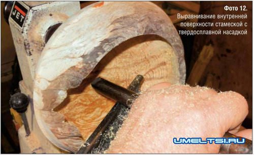 Для придания устойчивости стамеске, особенно в тех случаях, когда ее жало выходит за воображаемую линию оси приспособления, здесь имеются боковая рукоятка и пластиковый подлокотник (фото 11). Поскольку обод тарелки местами сильно опущен, подрезка привела к искажению его круглой формы, что, на мой взгляд, нисколько не снизило привлекательности изделия, а скорее даже наоборот. Резец коленчатой стамески точил плотную и довольно тяжелую древесину соснового сувеля очень легко, но оставлял после себя грубую поверхность, которую я впоследствии выровнял стамеской с твердосплавной круглой насадкой (фото 12). Толщина стенок тарелки не могла быть менее 8 мм из-за опасности появления дырок в местах глубоких складок на ободе, что было бы нежелательно. Размеры контролировались самодельным кронциркулем (фото 13). За глубиной расточки я следил с помощью самодельного глубиномера с учетом уже имеющегося наружного донного углубления. Поскольку кривизна стенки тарелки меняет направление, траектория движения последних двух стамесок при расточке полости большого значения не имела.