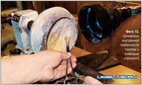 Что на самом деле важно, так это скорость ведения стамесок при обработке донышка, которая должна быть низкой, поскольку в этой области значительно уменьшается линейная скорость движения древесины. Так как тарелка - неглубокая посудина, при ее расточке обычно не возникает проблемы избыточного свеса стамесок с упора подручника, вызывающего нежелательную вибрацию резца и, как следствие, недостаточную чистоту поверхности. Теперь необходимо было выровнять внутреннюю часть тарелки методом скобления. Глубокожелобчатая стамеска для данной цели не годится, и я делал это с помощью скребка с отрицательным передним углом, изготовленного мною из круглой заготовки быстрорежущей стали толщиной 18 мм (фото 14). Преимуществами скребков данного типа являются низкая вероятность зарывов в древесину и высокая чистота отделки поверхности.