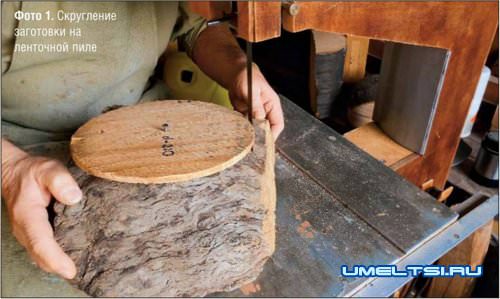Как всегда, первой операцией является скругление заготовки на моей самодельной ленточной пиле с применением фанерного круга, прибиваемого к верхней части заготовки в качестве шаблона (фото 1). У меня имеется набор из девяти таких кругов-шаблонов диаметром от 100 до 250 мм: в данном случае использовался шаблон на 210 мм. Можно, конечно, скруглить заготовку и с помощью цепной пилы, бензиновой или электрической, что я иногда и делаю на даче, хотя этот способ несколько более грубый