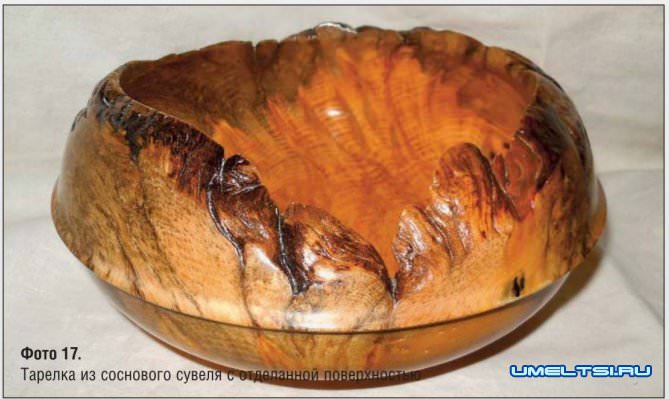 Результат порадовал глаз прекрасным сочетанием светло-коричневой свилеватой древесины в нижней части тарелки с сероватым верхом, переходящим в более темную складчатость обода (фото 17). Богатый опенками сероватый цвет древесины под корой, с которым я ранее уже сталкивался при точении сувелистой сосны, по-видимому, свидетельствовал о начальной стадии поражения синей гнилью, которая значительно повышает эстетические свойства.
