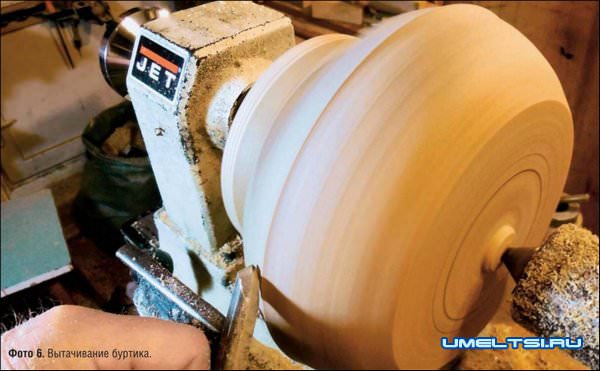 С помощью глубоколожелобчатой стамески толщиной 12 мм я выровнял заднюю поверхность заготовки (фото 5), направляя ее от центра к краю и держа почти в горизонтальном положении. При этом ее желоб невидим, т. к. он направлен в сторону донца (закрытое положение) и нижняя боковая режущая кромка работает больше как скребок, т. е. скоблит. Затем приступил к окончательному скруглению боковых поверхностей детали и их чистовой отделке. Техника точения здесь подразумевает постепенный переход от горизонтального положения стамески, дающего грубый рез, к наклонному с опущенной ручкой, что обеспечивает чистовой рез. Окончательную доводку проточенной поверхности обычно выполняют скребками. В свое время я сделал около десятка скребков самых различных форм, но пользуюсь ими для выравнивания внешней поверхности довольно редко: на данном этапе очень удобно применять все ту же свежезаточен-ную глубокожелобчатую стамеску, оттянутые назад «крылья» которой прекрасно скоблят поверхность, особенно в наклонном положении стамески. Если не хочется отходить от станка, чтобы воспользоваться точилом, можно быстро навести жало стамески с помощью алмазного оселка с зернистостью 600 ед., хотя я проделывал это оселками на 400 и даже 300 ед., причем, как мне кажется, вполне успешно. Делать это следует не более 2-3 раз, после чего целесообразно переточить стамеску на точиле с применением специального приспособления.