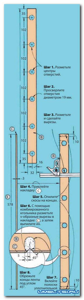 2. Из вспененного уплотнительного материала, применяемого для утепления окон, вырежьте шесть полосок размерами 13x70 мм. Удалите бумажную подложку и вставьте полоски в вырезы верхней гребенки, как показано в шаге 7 на рисунке «Изготовление верхней гребенки».
