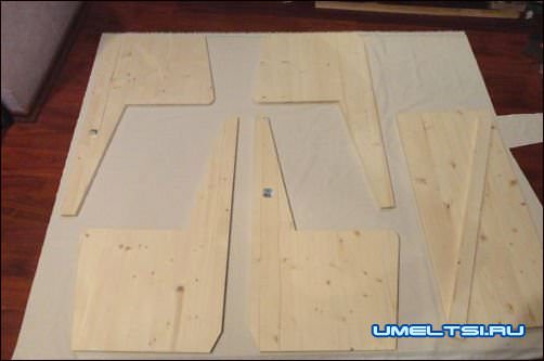 ■ Из мебельных щитов вырезали 6 боковин, 2 прямоугольные откидывающиеся и одну угловую сидушку (дня кошки), 2 спинки, 4 узкие планки (2 — для соединения боковин сверху и 2 — между сидушкой и спинкой), 2 нижних фасада (см. схемы).