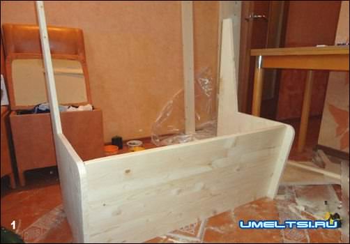 ■ Скамейки. Сначала решили собрать одну. Начертили необходимые элементы, выпилили. Проверили посадку передней планки и занялись контрольной сборкой. Затем собрали вторую скамейку (фото 1, 2). Исходя из ее размеров 91x60x97 см и общей длины (150 см), для обивки купили по 3 м светлого и зеленого флока. Клеили его поэтапно.
