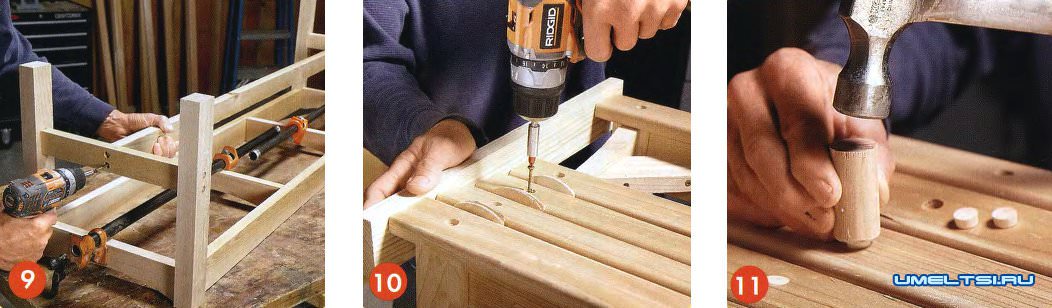 9. Присоедините собранные ножки к собранному сиденью шкантами и клеем, скрепите струбцинами. Затем прикрепите шурупами распорку.