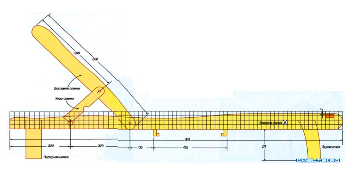 Конструкция шезлонга (от фр. la chaise longue — длинный стул) — простая и показана на рис. 1. Этот удобный лежак состоит из двух основных подсборок: удлинённого сиденья на ножках и спинки, которая может располагаться под различными углами. Основные размеры шезлонга показаны на рис. 2, а перечень деталей и материалы приведены в таблице.