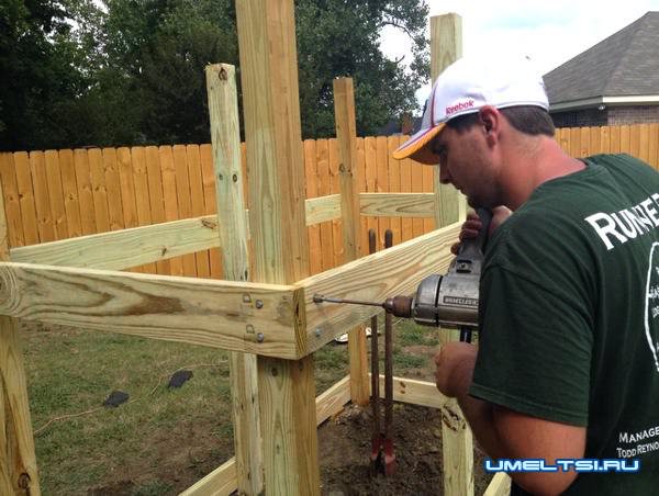 2. Соберите самый нижний уровень рамки площадки (на земле), потом по углам застопорите квадратными брусьями по углам. Готовые части каркаса скрепите винтами.