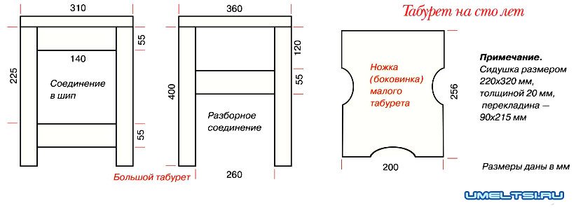Общая высота табурета из дерева — 420 мм, размер сиденья — 310х 360 мм. Для его изготовления табурета своими руками обработал пять дощечек толщиной 20 мм и склеил их табурете (см. выше).