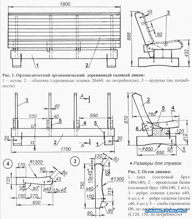К качеству исходных материалов особых требований нет: хватило б длины (кстати, один из брусьев балки — составной, а другой — клеёный по продольной трещине}, да было бы только поменьше смолевых сучков на лицевых поверхностях планок обшивки сиденья и спинки. Кстати, было бы неплохо изготовить планки из лиственных пород.