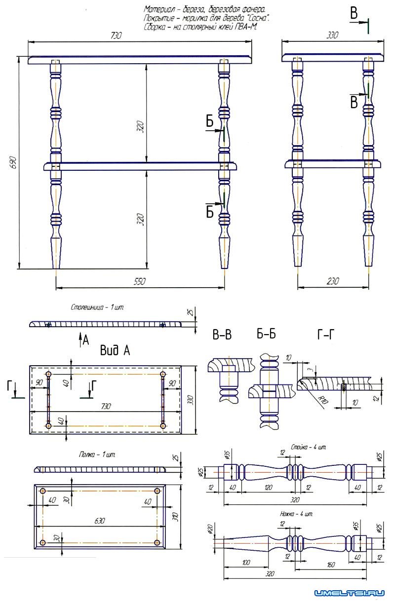 Располагая чертежами и нужным инструментом, сделать такой симпатичный столик можно за пару дней. Но нужно иметь токарный станок и уметь на нём работать.