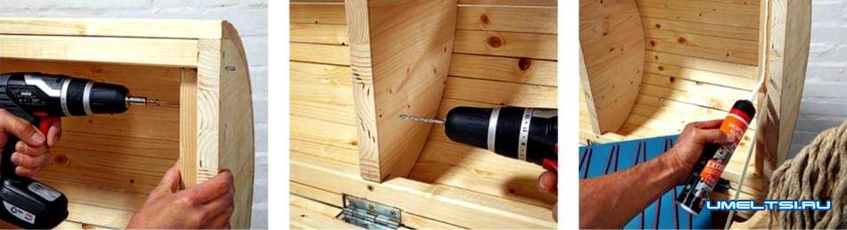 6. Перед соединением частей корпуса шурупами нанесите на контактные поверхности тонкую полосу водостойкого столярного клея.