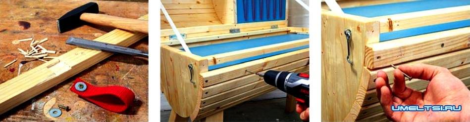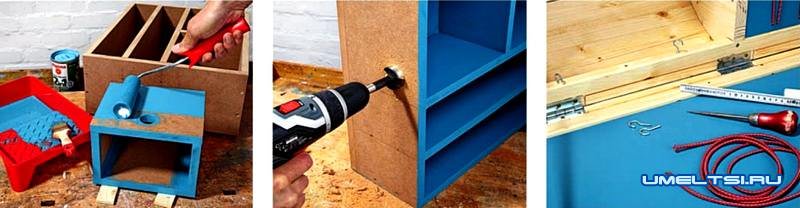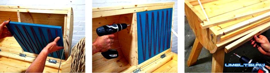 В левой стороне крышки достаточно места для комодика с выдвижными ящиками. Маленькая хитрость со шнуром поможет предотвратить выпадение ящиков при откидывании.