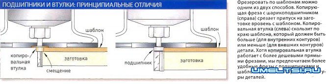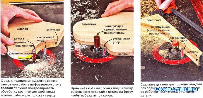 Копирующая фреза с подшипником у хвостовика работает точно так же, но нужно перевернуть деталь, чтобы шаблон был обращен к поверхности стола, как показано на среднем и правой фото, или