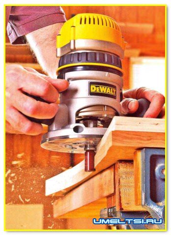 к подошве фрезера. Фрезеруйте деталь точно так же, как и на фрезерном столе. Для работы с фрезером в руках требуется приподнять деталь, которая находится внизу, с помощью подкладок, чтобы не испортить поверхность верстака.