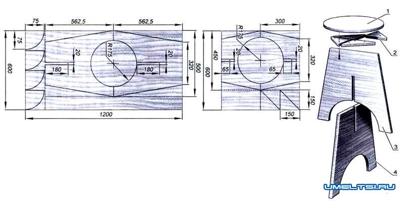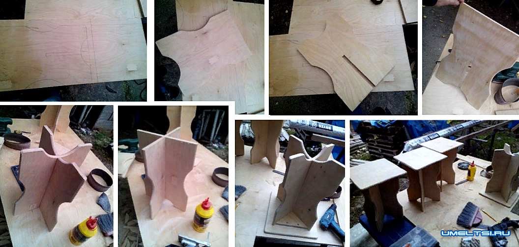 Итак, приступим. Разметка. От ее точности во многом зависит внешний вид любого изделия, а не только обычной табуретки, поэтому отнеситесь к этой операции ответственно. Но это только полдела. Следующий этап - распил заготовок -не менее важен. Особенно, когда это раскрой одного листа. Ведь если ошибиться и «вильнуть» пилкой лобзика в сторону, то пострадают сразу две детали. Одну еще можно выправить, удалив лишнее, а вот со второй будет куда сложнее. Благо, данная конструкция позволяет легко устранить большинство огрехов. Даже если не удастся за один проход получить идеальные кромки круглого сиденья и ответных вырезов в ножках - не огорчайтесь. Просто обработайте элементы по отдельности соответствующим режущим инструментом фрезера еще раз. Пусть лучше диаметр сиденья уменьшится на несколько миллиметров - никто этого не заметит, а вот неровности и выщербины на кромках сразу обратят на себя внимание.