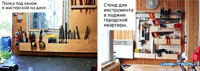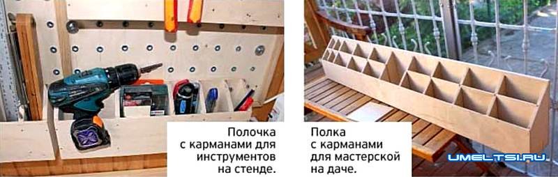 В прошлом году на балконе своей городской квартиры я повесил стенд с рядами отверстий для навески инструментов. В нижней части стенда у меня сделаны карманы, изготовленные из фанеры толщиной 10 и 4 мм. Размеры отделений небольшие - 60 x 60 и 80 x 60 мм. В них храню инструменты, которые нельзя подвесить. Такой стенд я бы сделал и в мастерской на даче, но там мало места под окном. А вот полку с карманами сделать можно.