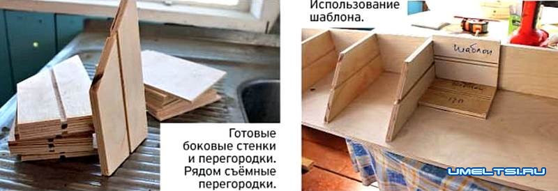 Предварительно промазав клеем ПВА края очередной перегородки с пазами, пристраивал её вплотную к шаблонам, а затем фиксировал маленькими саморезами через дно и заднюю стенку. Следующий этап - закрепление передней стенки с помощью клея ПВА и гвоздей.