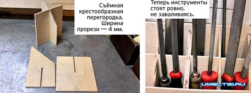 Ручки плоскогубцев, круглогубцев, кусачек и ножниц по металлу свободно входят в большое отделение и «садятся» на съёмную перегородку. Но когда напильники и стамески ставишь ручками вниз, они заваливаются вправо и влево. Поэтому вместо продольных перегородок сделал крестообразные, собираемые из двух половинок.