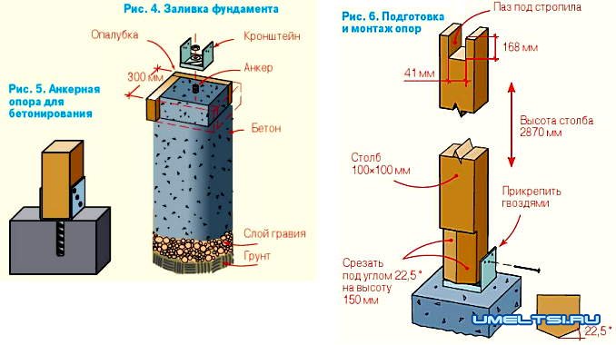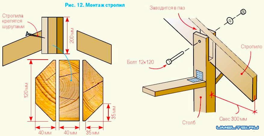 Стропила с одной стороны фиксируются в паз, проделанный в опорных столбах, а с другой -прибиваются к центральному анкеру (рис. 12).