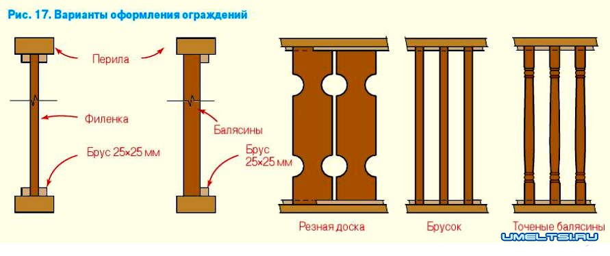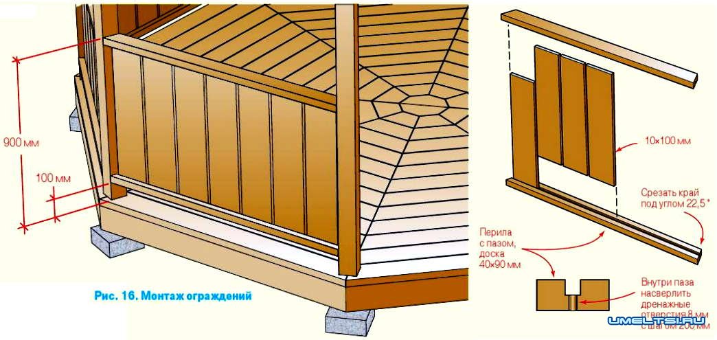 Отдельно собираются ограждения. В досках, служащих перилами, выбираем паз, который заполняем рейками, выдерживая между ними расстояние, равное 5-7 мм (можно немного больше) (рис. 16). В пазу каждые 20 см проделайте сквозное отверстие для стока воды.
