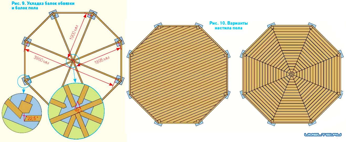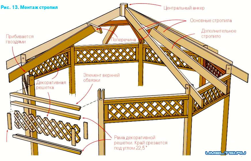 Для стропил берем доску 40x100 мм, длиной 2500 мм. С двух сторон стропила срезаются противоположные углы под углом 22,5 °. Сначала устанавливаются два противоположные стропила. Они заводятся в паз столба, где фиксируются болтом. К одной стропилине еще на земле прикручивается шурупами центральный анкер, представляющий собой восьмиугольник, собранный из трех сплоченных на водостойкий клей досок сечением 40x120 мм (рис. 12).