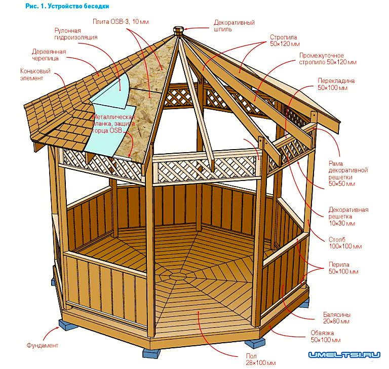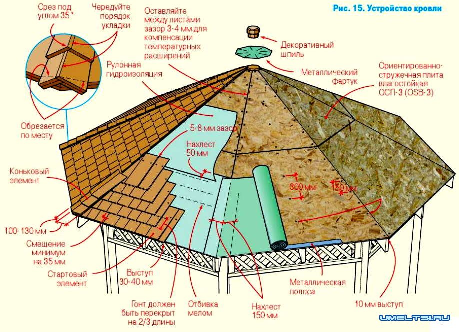 Чтобы они не просматривались изнутри беседки, обрешетку лучше выполнить сплошной, используя влагостойкую фанеру ФСФ или листы ОСП-3 (OSB-3). Под ним в обязательном порядке выполняется гидроизоляция (рис. 15).