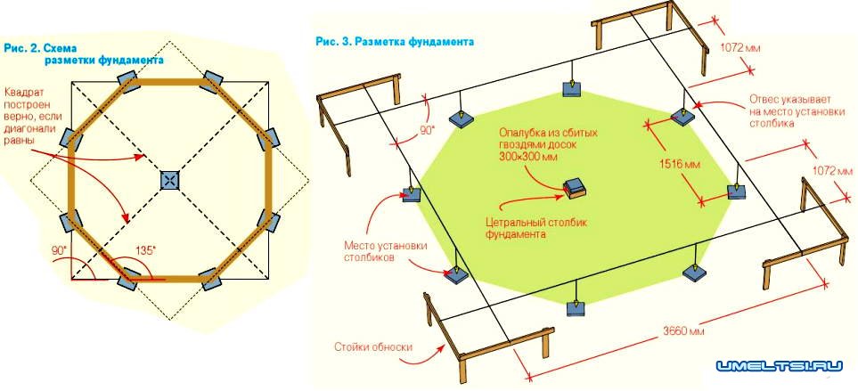 Представленная вашему вниманию беседка имеет в своей основе восьмиугольник, с разметки которого и начинается строительство. Создаем восьмиугольник на основе квадрата путем срезания углов (рис. 2). Таким образом все внутренние углы очерченного восьмиугольника будут равны 135 °. Для этого сначала вбиваются колышки, как показано на рис. 3, к которым привязывается шнур, образующий квадрат с длиной грани, равной 3660 мм. Проверьте, чтобы углы были именно 90 °, диагонали должны быть равны 5176 мм. В месте пересечения диагоналей отметьте место под устройство центрального столбика фундамента.