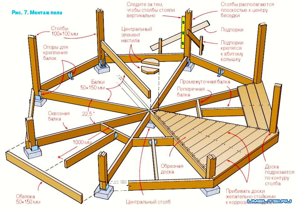 Монтаж беседки начинается с подготовки каркаса - восьми опорных столбов (рис. 6). Столбы должны иметь сечение 100x100 мм, длиной 2870 мм. В верхней части заранее проделывается паз глубиной 168 мм и шириной 41 мм для крепления стропил.