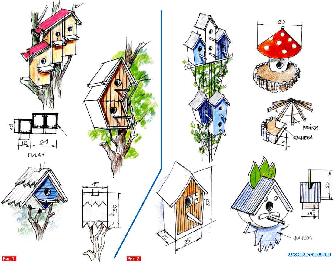 На рис. 2 показаны различные декоративные варианты скворечников. Их можно красить в яркие цвета. Такие изделия подходят для украшения шпалеры или перголы в саду, открытой веранды или беседки.