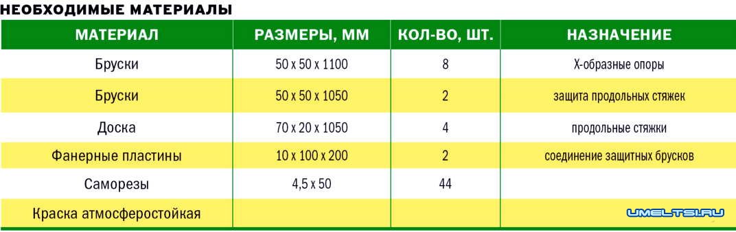Работу я начал с изготовления Х-образных опор. Прострогал и опилил бруски в размер 110 см. Разметил места соединения «ног» опор попарно, наложив их одну на другую под углом 60° и выдержав размер 29 см (см. рисунок).