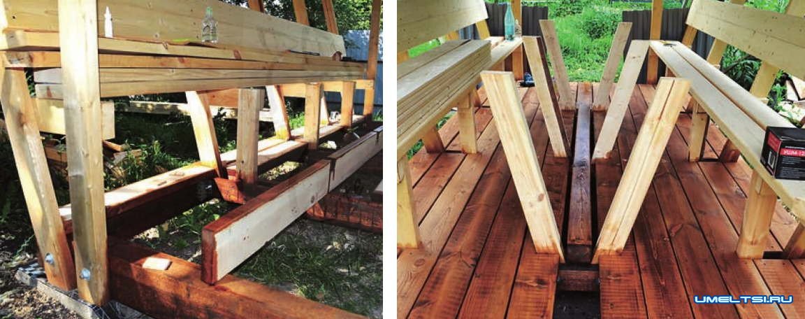 Опоры для скамеек, так же как и все остальные опоры, выполнены из бруса 100x50 мм, спинки лавок из шпунтованных досок толщиной 36 мм, а лавки и пол - из досок 150x40 мм. Для крепления использовались черные саморезы 4,8x100 мм и 4,8x75 мм.