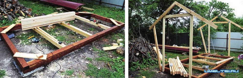 Продольные доски в верхней части конструкции — временные, они нужны для правильной и удобной установки боковых опор и А-образных элементов крыши. Нижние поперечины и боковые опоры стягиваются между собой шпильками и дополнительно крепятся уголками к балкам основания.