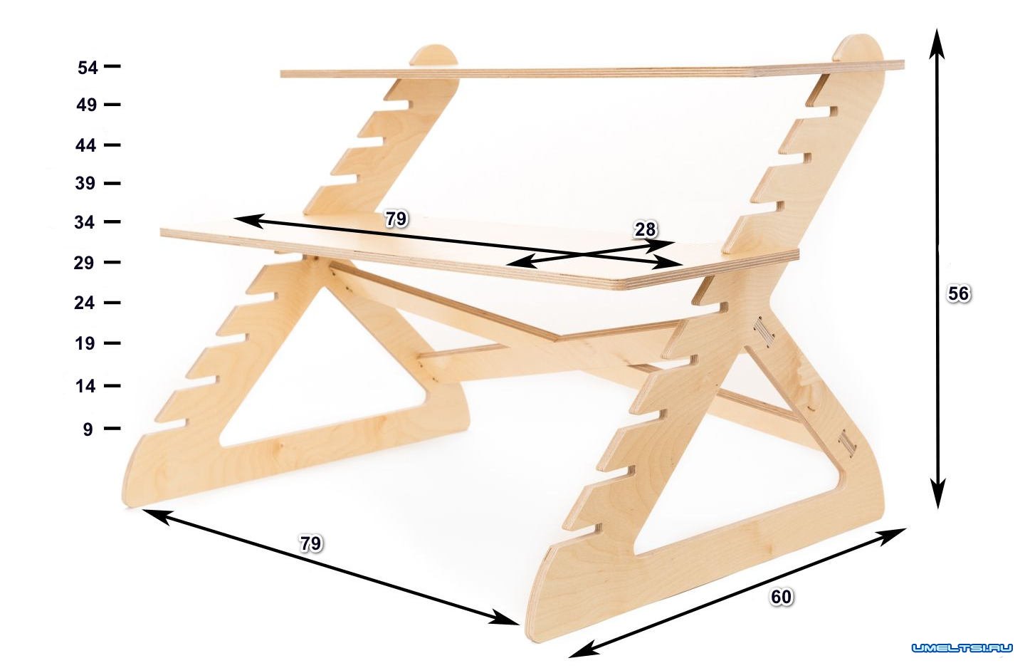 Размеры деталей приведены выше, по них и делаем стоячий стол. Прорези, куда будут вставляется полочка или стол зависит от толщины фанеры с которой будет изготовлен весь стол.