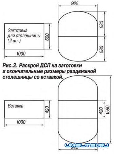 Для изготовления раздвижного стола я использовал ДСП, размеры которой —600x3000x28 мм. Разметил её и разрезал по размерам (см. рис. 2) на три части. Две из них — одинаковые, размерами 600x925 мм, а третья (для вставки) — размерами 420x925 мм. Вставку можно сделать шириной до 500 мм.