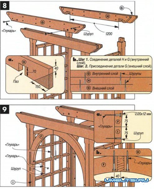 Схема сборки и основные детали перголы показаны на рис. А. Опорами служат четыре столба, имеющие сечение 90x90 мм и сделанные из хвойного бруса. Между опор напротив друг друга размещены пара решёток и два арочных элемента. Венчает перголу про-стейшая стропильная система с рядом досок обрешётки. Столбы на подготовленном основании можно закрепить предварительно забетонированными анкерными болтами или анкерными болтами со специальными дюбелями. Основание может быть в виде бетонной плиты по размерам перголы или в виде четырёх фундаментных столбов, отлитых непосредственно в грунте.