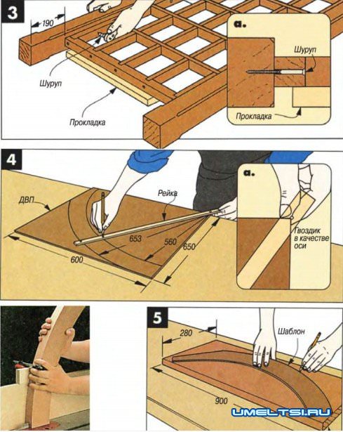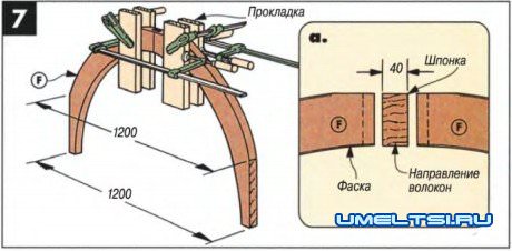 Каждая арка состоит из двух стоек и двух арочных элементов — полуарок (рис. В). Изготовление арок начинают с разметки шаблона, который вырезают из листа оргалита (рис. 4). По этому шаблону размечают и выкраивают полуарки. Материалом для них может послужить широкая доска или столярный щит необходимых размеров (рис. 5). Для соединения полуарок в них выбирают паз под прямоугольную шпонку-вставку (рис. 6). Склеивая арку, её фиксируют с помощью струбцин до полного высыхания клея (рис. 7).