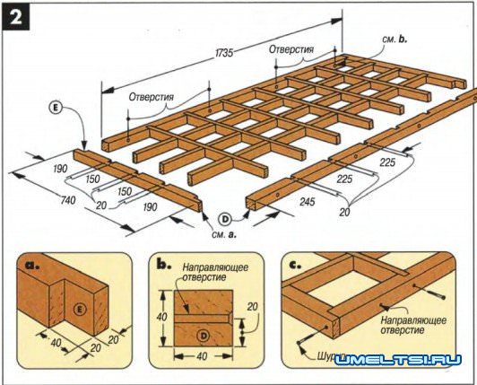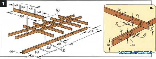 Опорные столбы в верхней части имеют шипы для соединения со стропилами и декоративные «каннелюры». Решётка представляет собой раму с пересекающимися вставками, соединёнными «вполдерева». Размеры деталей рамы, её сборка и соединение с опорами показаны на рис. 1-3. Раскрой пиломатериала и выборку пазов для соединения «вполдерева» удобно вести на стационарной циркулярке.